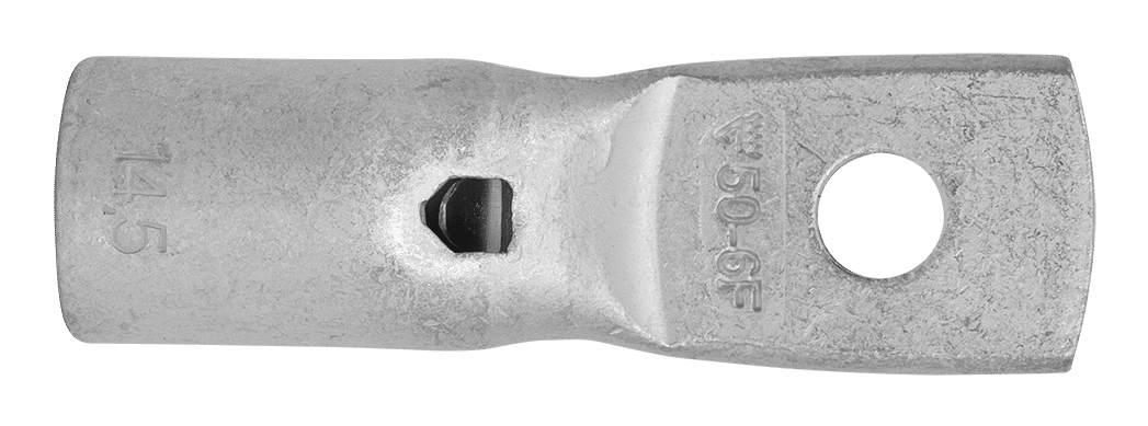 Rohrkabelschuh mit schmaler Platte für feindrähtige (Klasse 5) und mehrdrähtige (Klasse 2) Kupferleiter (gemäß IEC 60228), 50 mm², Platte mit M-6-Loch. Verwendung mit den zertifizierten Elpress-Systemen PVL350, V600, DV1300, DV250.