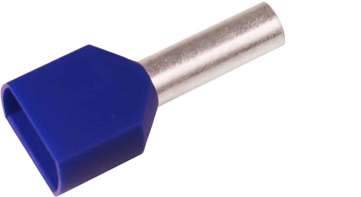 Isolierte TWIN-Aderendhülse ETW2, 2,5 mm². Verwendung mit dem zertifizierten Werkzeug PEB0110T.
