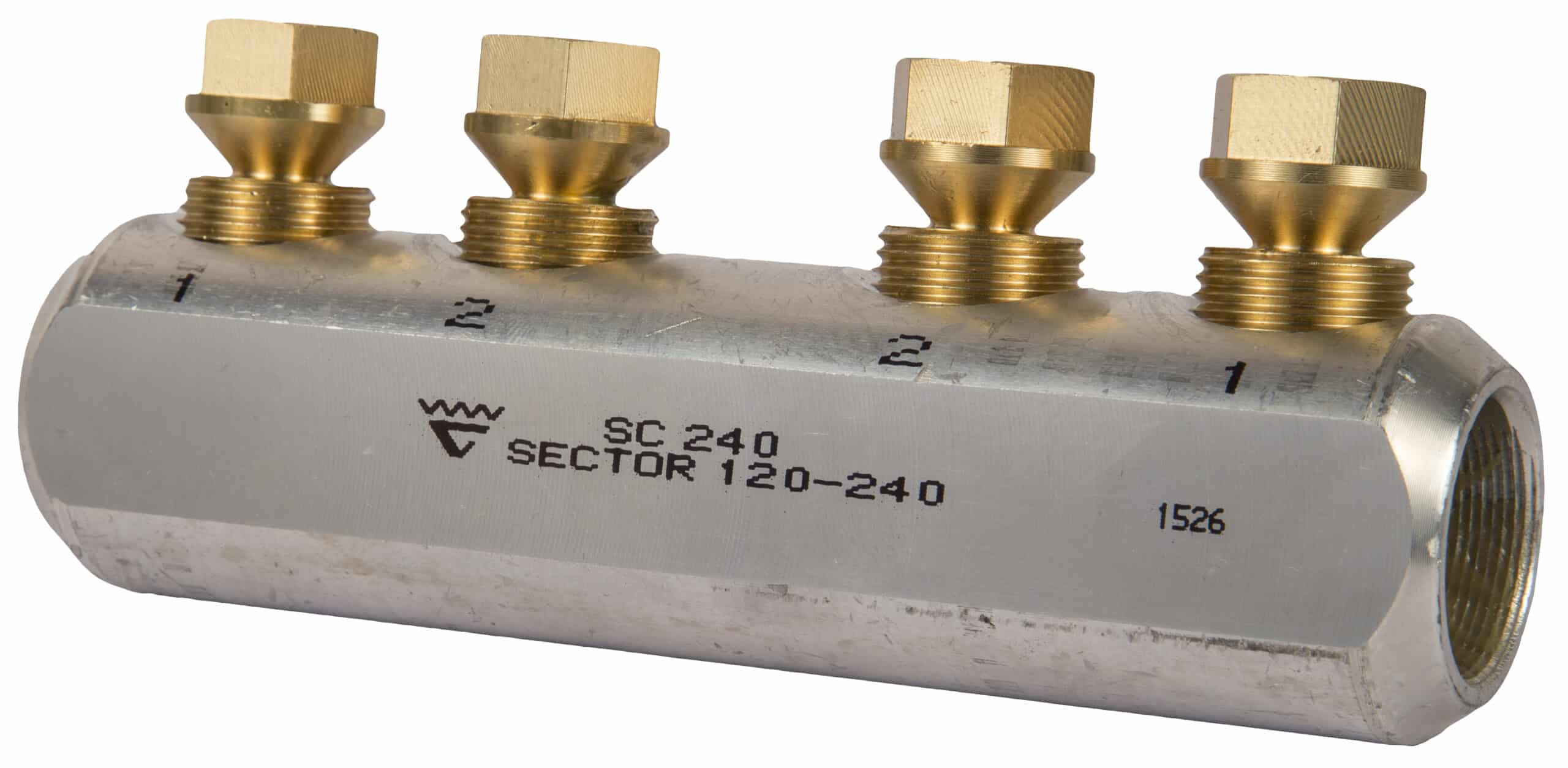 Schraubverbinder 1 kV, passend für Al- und Cu-Leiter der Klasse 1 und 2. Rundleiter 95-240 mm², Sektorleiter 120-240 mm². Beim Verbinden von Schirmleitern mit 29-146 mm² kommt die Einlage SC240/PEN zum Verbinden der Kupferabschirmung des Kabels zum Einsatz.