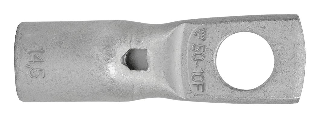 Tube terminal with narrow palm for multi-stranded (class 5) and stranded (class 2) Cu conductors (acc. to IEC 60228), 50 mm², with an M10 hole in the palm. Used with Elpress certified systems V600, V1300, V250.