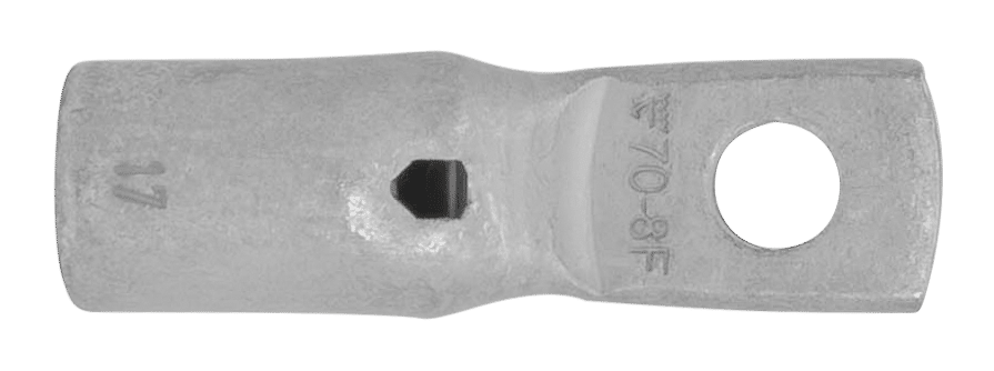 Tube terminal with narrow palm for multi-stranded (class 5) and stranded (class 2) Cu conductors (acc. to IEC 60228), 70 mm², with an M8 hole in the palm. Used with Elpress certified systems V600, V1300, V250.