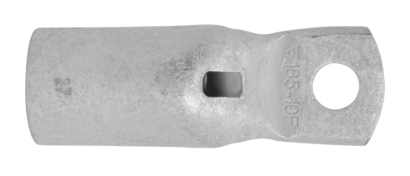 Tube terminal with narrow palm for multi-stranded (class 5) and stranded (class 2) Cu conductors (acc. to IEC 60228), 185 mm², with an M10 hole in the palm. Used with Elpress certified systems V1300 or V250.