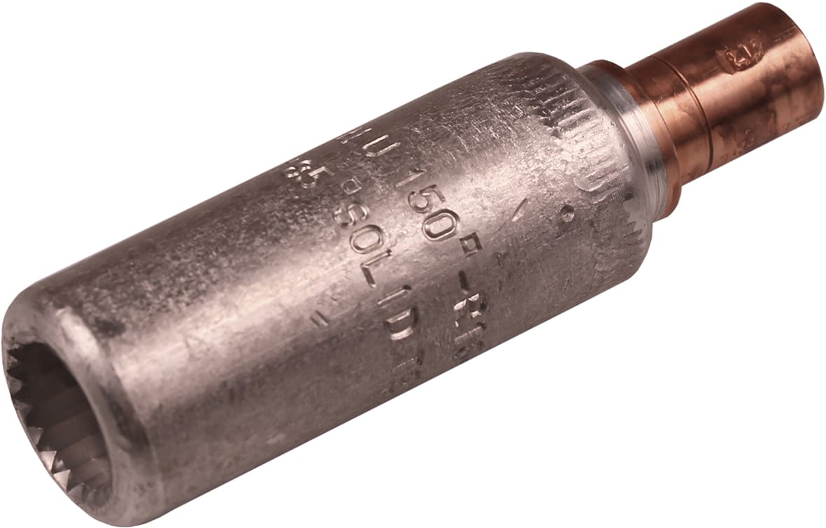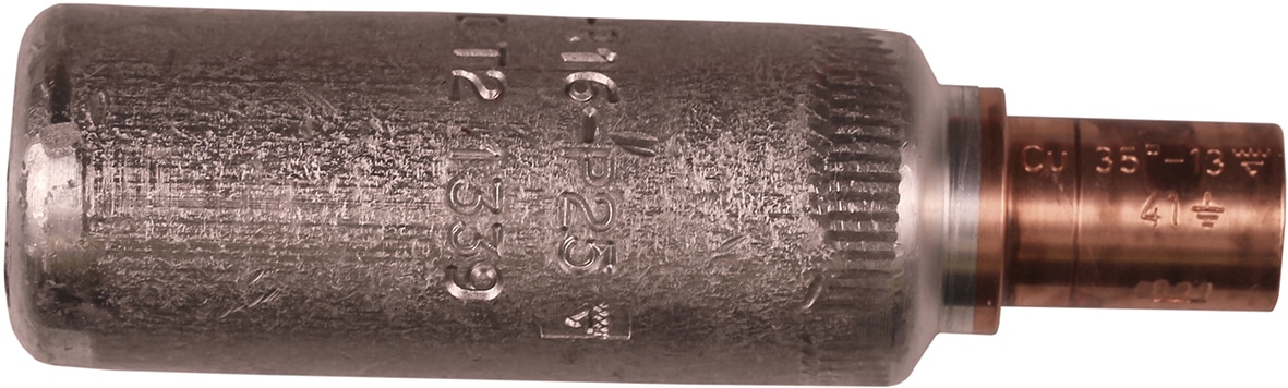 AlCu through connector, from Al conductor to Cu conductor. For stranded Al cable 150 mm², or for solid Al cable 185 mm², to stranded/multi-stranded Cu cable 95 mm². When crimping the Cu section, place the dies between the mark on the sleeve and the edge of the Cu section. Used with Elpress certified systems V1300, V250.
