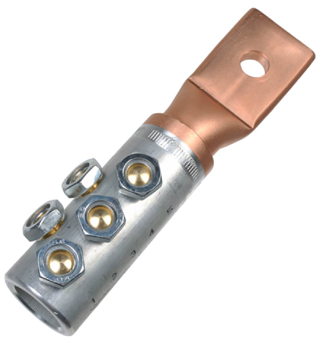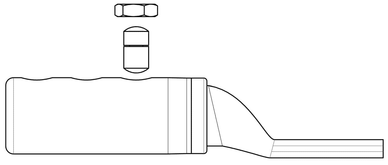 Shearbolt terminal 1-36 kV suitable for both Al and Cu class 1 and class 2 cable, with M14 hole in the palm. Round cable 500-630 mm².