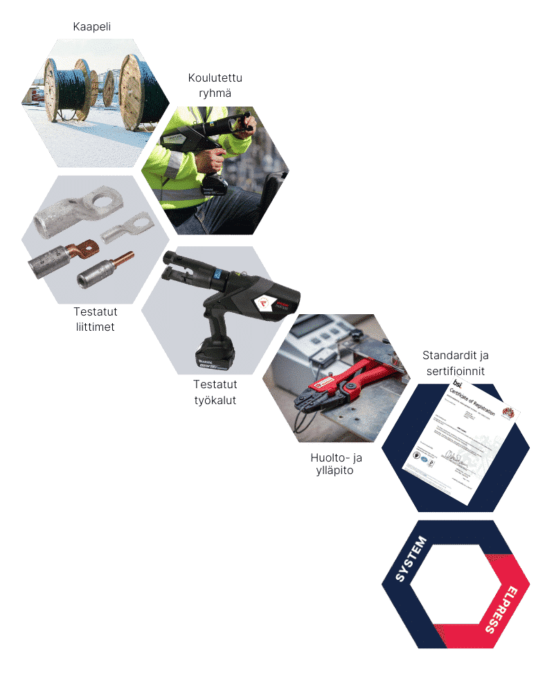 Valmistamme putkikaapelikenkiä (tyyppi KR/KR/KRF/KRD/KRT), jatkoholkkeja (tyyppi KS/KSF/KSD/KST) ja C-hylsyjä myös räätälöityjä liitoksia varten. Elpress-järjestelmä soveltuu sekä IEC 60228 -luokan 2 mukaisille harvasäikeisille johtimille että IEC 60228 -luokan 5 ja 6 mukaisille joustaville johtimille.