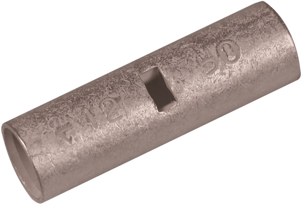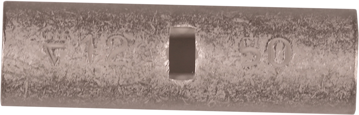 Uninsulated through connector for stranded (class 2) Cu conductors, 50 mm². Used with Elpress certified systems V600, V1300 or V250.