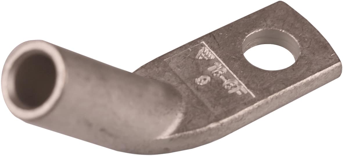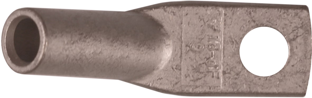 Angled tube terminal 45° for multi-stranded (class 5) and stranded (class 2) Cu conductors (acc. to IEC 60228), 10 mm², with an M6 hole in the palm. Used with Elpress certified systems V600, V1300, V250.